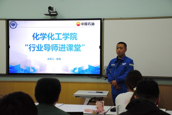 在石油炼制工程的课堂上,袁海从生产工艺、特色品牌、产品效益等方面向学生们介绍了抚顺石化公司整体情况。随后,通过对我国炼油技术“五朵金花”的讲解,拓宽学生石油工艺知识面,增强行业自豪感。