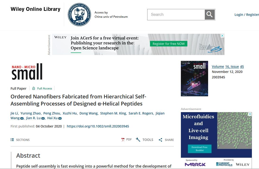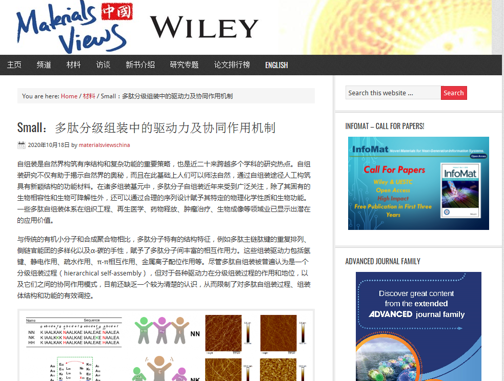 题为《通过α-螺旋肽的设计和分级组装制备纳米纤维组装体》(Ordered Nanofibers Fabricated from Hierarchical Self-Assembling Processes of Designed α-Helical Peptides)发表在在化学类TOP期刊Small上,并被选为封面文章。同时,该成果被Wiley MaterialsViews中国作为研究亮点进行了报道。这项研究工作提供了一类具有通用性的分子自组装模型,设计的螺旋肽分子基于一个自身互补的氨基酸序列,与双肽分子的组装系统相比,这样的设计方式允许更便捷的在氨基酸序列中引入功能性氨基酸残基,可以更加有效地指导多肽自组装过程和制备功能性纳米组装体。该工作为生物超分子功能体系的分级构筑提供了可以借鉴的策略,如纳米原纤维的分级组装、含金属离子活性中心的多肽组装体等,这些组装结构可用于生物功能材料和仿生催化等领域。审稿专家高度评价了多肽的分子设计策略,认为将不同的非共价驱动力引入了单个多肽序列中,可以根据它们对自组装的影响系统比较不同非共价相互作用的影响。同时也认为在多肽跨尺度自组装特性研究中,作者所开发应用的一系列实验方法具有很好的创新性。这一工作有助于系统理解自组装驱动力之间的关系和分子相互作用机理。