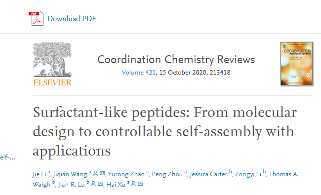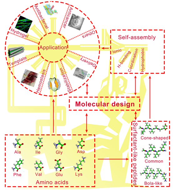 题为《类表面活性剂多肽:分子的设计、可控组装和应用》 (Surfactant-like peptides: From molecular design to controllable self-assembly with applications)发表在化学类顶级综述Coordination Chemistry Reviews上,该综述以20种常见氨基酸的理化性质为切入点,详细描述了类表面活性剂短肽(Surfactant-like peptides或SLP)的设计规则和可控组装,包括氨基酸的取代、分子序列的改变、分子的长度、氨基酸的手性和组装体溶剂等,以及多肽组装体在细胞培养、抗菌和抗癌治疗,药物递送和控释,仿生矿化和纳米加工,止血和膜蛋白稳定化等方面的应用。这篇综述不仅为SLP的研究做了全面的介绍,还为后续进行SLP的基础研究和开发提供了重要的参考。