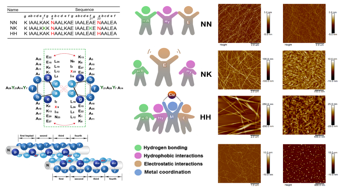 基于此认识,生物界面与材料研究团队在前期短肽自组装调控机制研究的基础上,设计了一组含有28个氨基酸残基的α-螺旋肽,通过圆二色性光谱仪、原子力显微镜、小角中子散射等技术并结合分子模拟手段,研究了α-螺旋肽的自组装过程。工作系统展示了氢键、疏水相互作用、静电相互作用和金属离子配位等四种组装驱动力在多肽自组装过程中的协同作用机理和多肽的分级组装机制。通过对不同驱动力在不同组装层级上的合理调控,得到了不同形貌和结构的纳米组装体。